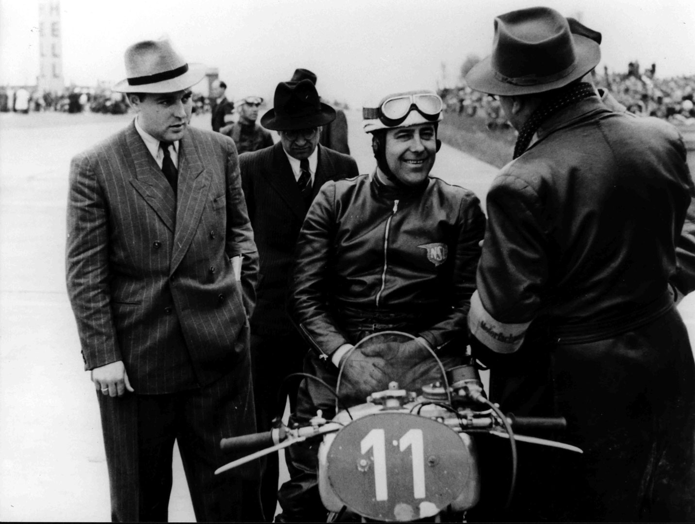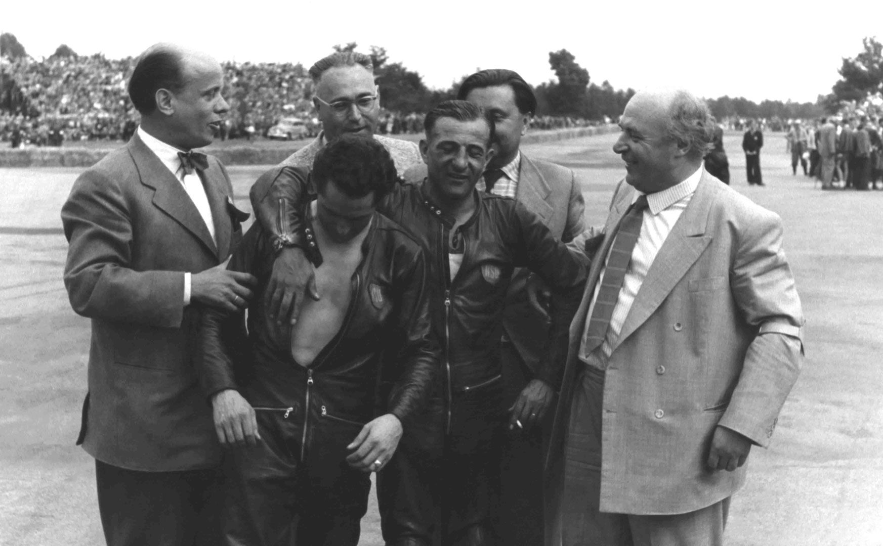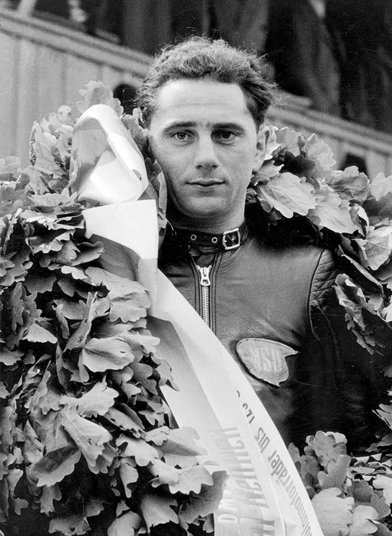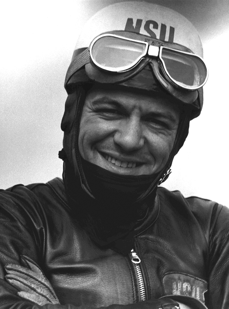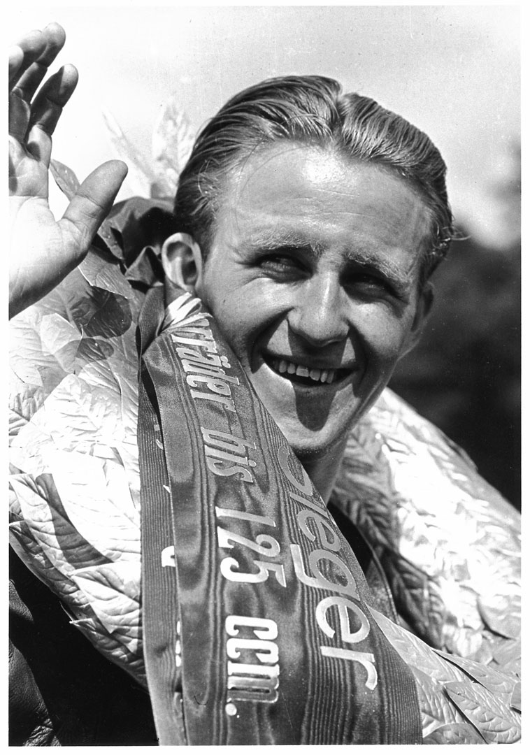 Als es dann endlich vorbei war, gab es jedoch vorerst keine Automobilrennen mehr. Ich kehrte zum Motorrad zurück. Mit einer käuflichen 250er DKW-Rennmaschine startete ich als Privatfahrer. Sieg reihte sich an Sieg. 1950 war es dann soweit. Die AUTO UNION verpflichtete mich erneut als Werksfahrer. In der Folgzeit konnte ich viermal Deutscher Meister der Soloklassen 125 bzw. 250 ccm werden. 1952 fuhr ich für die italienische Firma Mondial und 1953 für Horex. 1954 verpflichtete mich NSU. Wieder einmal war ein Deutscher Meister-Titel fällig, dieses Mal jedoch in der Klasse bis 350 ccm. Die eigentlichen Höhepunkte des zweiten Abschnitts meiner Rennfahrerlaufbahn sollten aber erst noch kommen. Ende 1954 wurde dem NSU-Team seitens der Geschäftsführung eröffnet: „NSU fährt werkseitig keine Straßenrennen mehr! Aber, man