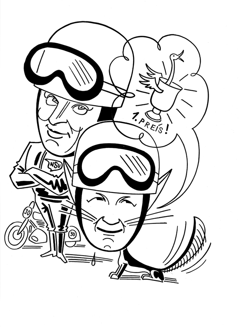 Bild: Cartoon des Gespann-Teams Böhm/Fuchs aus der NSU Presseabteilung (1950).
