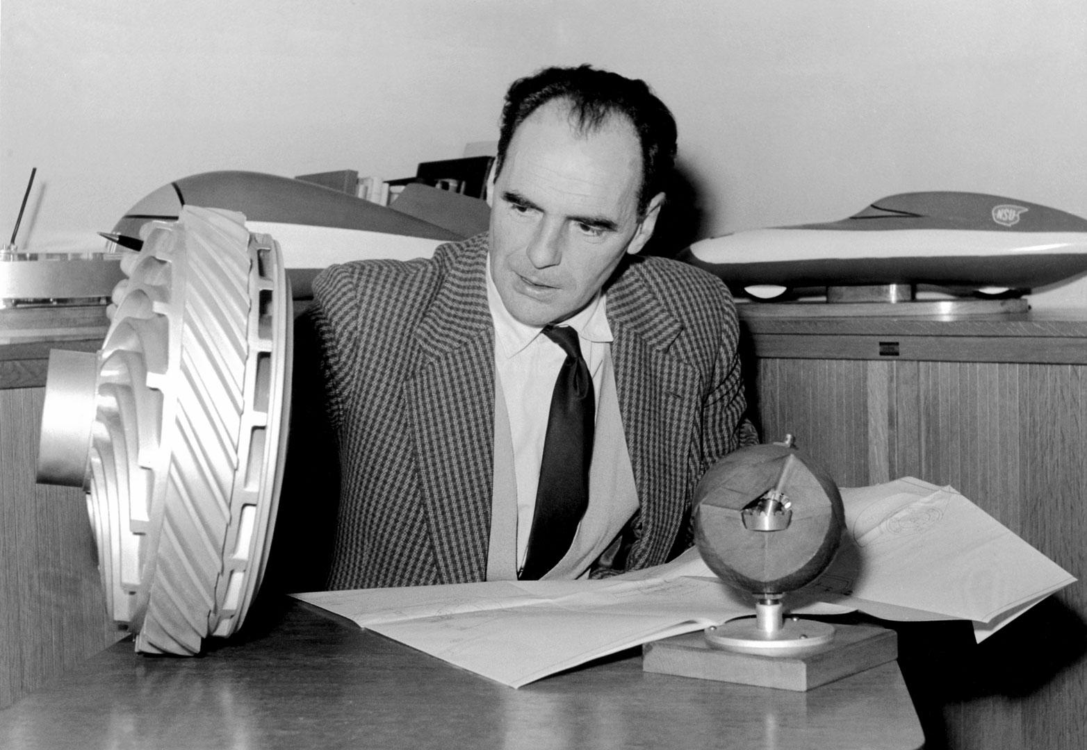 Bild: Dr. Froede mit Modellen seiner Rekordfahrzeuge und Teilen eines Wankelmotors (1955).