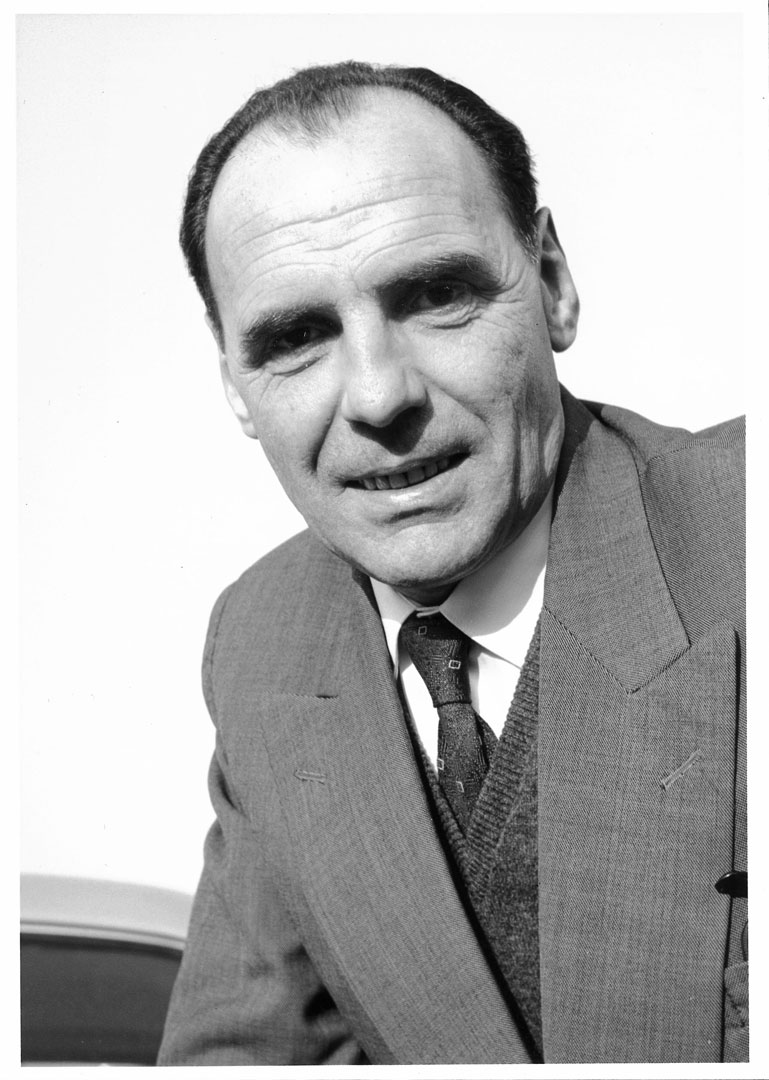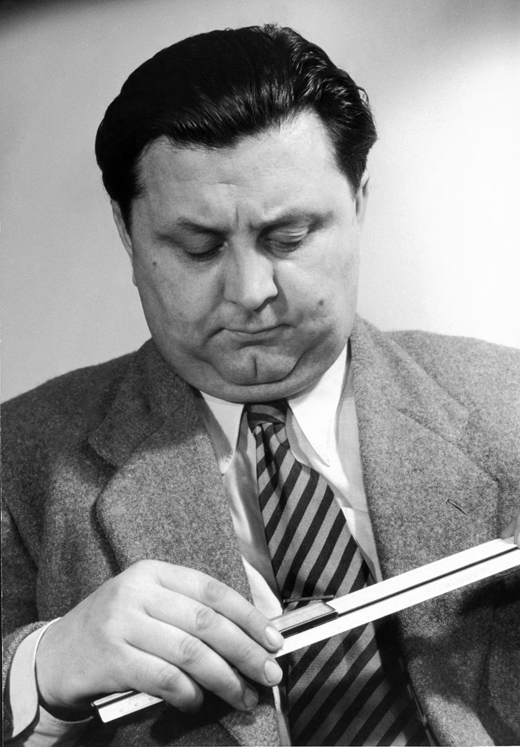 Bild: Der Konstrukteur Albert Roder an seinem Arbeitsgerät (1950).