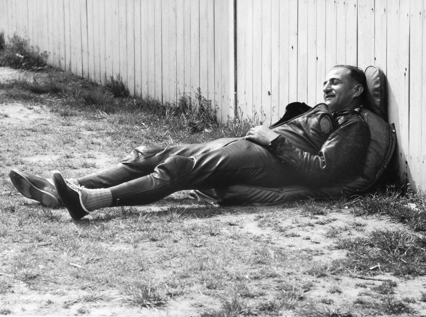 Bilder: H. P. Müller mit Gattin Mariele vor dem heimischen Pokalschrank (1954) und „Renntiger“ Müller beim Entspannen im Fahrerlager (1954).
