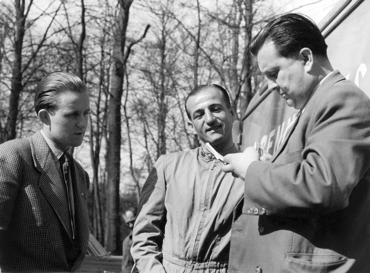 Bild: Ewald Praxl mit Rupert Hollaus und H. P. Müller am NSU Rennbus (1954).