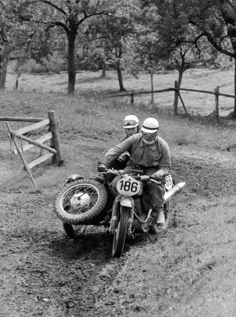 Bild: Werner Sautter/Karl-Heinz Piwon mit ihrem NSU Geländemax Gespann auf grüner Wiese (1955).