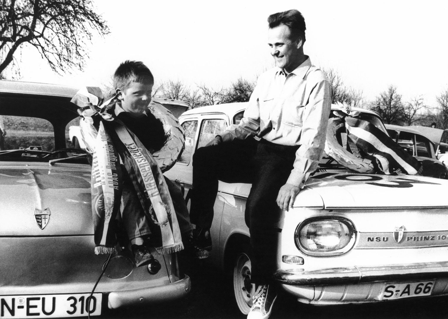 Bild: Familienfoto (von links): Siegfried Spiess mit Sohn, NSU Prinz II (30), NSU Prinz 1000 und Siegerkränzen (1965).